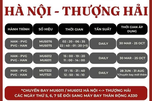 China Eastern Airlines hiện khai thác chuyến bay giữa Hà Nội (HAN) và Thượng Hải (PVG) hàng ngày, với các khung giờ đa dạng nhằm đáp ứng nhu cầu di chuyển linh hoạt trong mùa cao điểm hè.